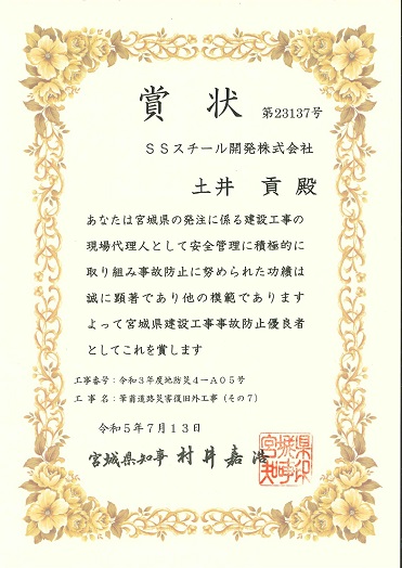 宮城県建設工事事故防止優良者を受賞しました。 2023/07/27 伊具郡丸森町筆甫地内における筆甫道路災害復旧外工事で、 弊社現場代理人の土井 貢が建設工事事故防止優良者を 受賞いたしました。 賞状はこちらからご覧いただけます