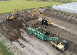 SSスチール開発では、自社保有の環境機械(ジョークラッシャー、コーンクラッシャー等)を組み合わせ、路盤材から各種盛土材まで安定品質の材料を生産しております。自社採取場を宮城県(亘理町、山元町、大和町)、福島県(南相馬市原町、南相馬市小高)に多数展開することで、公共工事から民間工事まであらゆるニーズに、スピーディーに対応でき高い評価を頂いております。